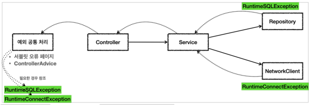 - 시스템에서 발생한 예외는 대부분 복구 불가능 예외이다. 런타임 예외를 사용하면 서비스나 컨트롤러가 이런 복구 불가능한 예외를 신경 쓰지 않아도 된다. 물론 이렇게 복구 불가능한 예외는 일관성 있게 공통으로 처리해야 한다.