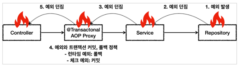 예외가 발생했는데, 내부에서 예외를 처리하지 못하고, 트랜잭션 범위( @Transactional가 적용된 AOP ) 밖으로 예외를 던지면 어떻게 될까?