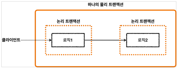 - 이러한 논리 트랜잭션 개념은 트랜잭션이 진행되는 중에 내부에 추가로 트랜잭션을 사용하는 경우에 나타난다. 단순히 트랜잭션이 하나인 경우 둘을 구분하지는 않는다. (더 정확히는 REQUIRED 전파 옵션을 사용하는 경우에 나타나고, 이 옵션은 뒤에서 설명한다.)