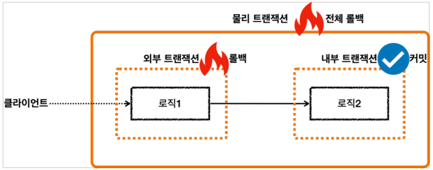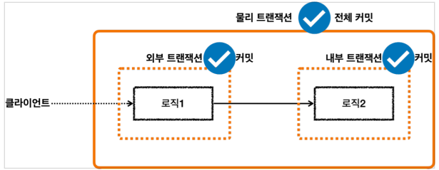 - 이렇게 트랜잭션이 내부에서 추가로 사용되면 트랜잭션 매니저에 커밋하는 것이 항상 물리 커밋으로 이어지지 않는다. 그래서 이 경우 논리 트랜잭션과 물리 트랜잭션을 나누게 된다. 또는 외부 트랜잭션과 내부 트랜잭션으로 나누어 설명하기도 한다.