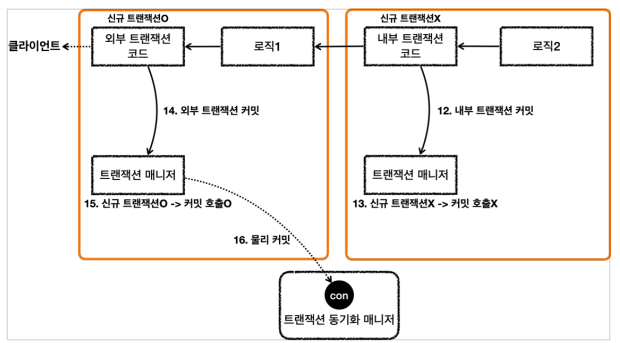 - 로직 1이 끝나고 트랜잭션 매니저를 통해 외부 트랜잭션을 커밋한다.