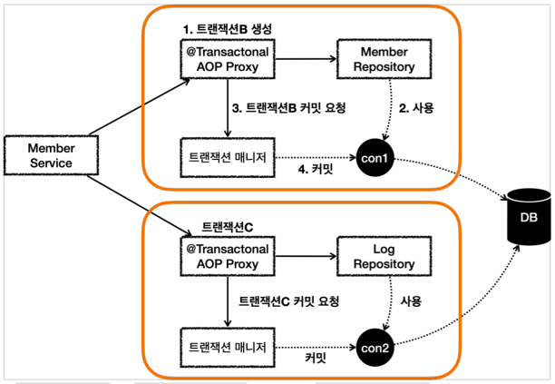 이렇게 해서 MemberRepository 와 관련된 모든 데이터는 정상 커밋되고, 트랜잭션 B는 완전히 종료된다. 이후에 LogRepository를 통해 트랜잭션 C를 시작하고, 정상 커밋한다. 결과적으로 둘 다 커밋되었으므로 Member , Log 모두 안전하게 저장된다.