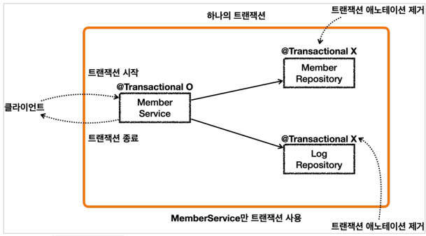 - 클라이언트 A만 생각하면 MemberService에 트랜잭션 코드를 남기고, MemberRepository , LogRepository의 트랜잭션 코드를 제거하면 앞서 배운 것처럼 깔끔하게 하나의 트랜잭션을 적용할 수 있다.