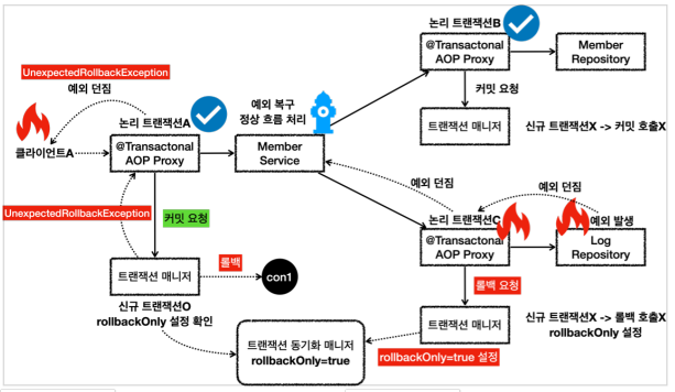 - rollbackOnly 상황에서 커밋이 발생하면 UnexpectedRollbackException 예외가 발생한다.