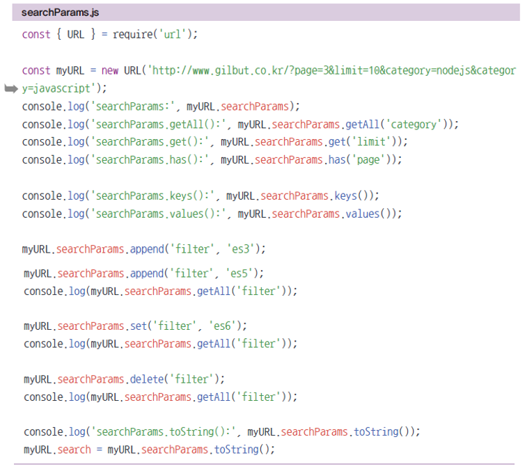WHATWG 방식에서 쿼리 스트링(search) 부분 처리를 도와주는 객(?page=3&limit=10&category=nodejs&category=javascript)