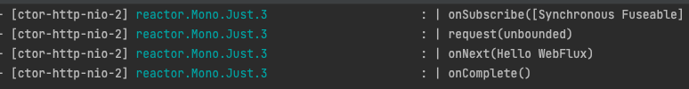 - onNext()로 Mono로 생성한 데이터를 전달하고, onComplete를 실행하는 것을 확인할 수 있다.