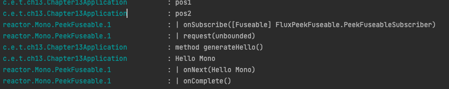 Mono m = Mono.just(msg).doOnNext(c -> log.info(c)).log(); //pos1 -> method generateHello() -> pos2 실행후 비동기실행 로그가 출력된다.
