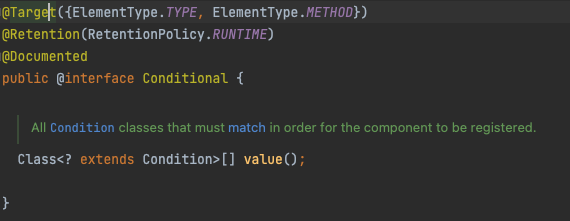 - 스프링 부트는 자주 사용되는 조건부 애노테이션을 재사용성을 위해 미리 정의하여 제공한다. 이러한 애노테이션은 @ConditionalOn이라는 이름으로 시작한다.