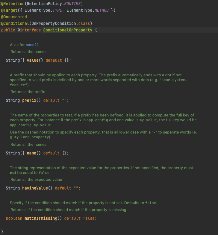 - prefix는 spring.aop로 시작하는 프로퍼티가 있는지를 검사, name은 prefix 뒤에 들어가는 프로퍼티 이름을 의미한다.