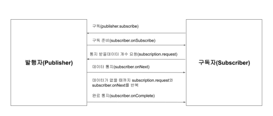 - 이때, Publisher가 통지하는 데이터의 수는 Subscriber가 요구하는 수와 같거나 적어야 하며, 이런 사양이 있는 이유는 Publisher가 너무 많은 데이터를 통지해 Subscriber가 처리할 수 있는 양보다 많아지면 시스템에 문제가 발생할 수 있기 때문에 적절하게 처리량을 조절하기 위함이다.