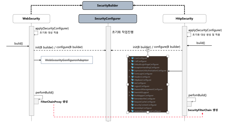 - 빌더 클래스를 생성하는 과정에서, SecurityConfigure에 있는 init, configure 메서드를 호출하면서, 설정 클래스를 생성한다.