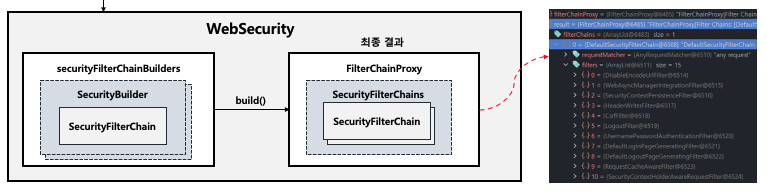 - build()를 하게 되면, 실제 WebSecurity가 생성이 되고, 최종 결과로, FilterChainProxy 객체가 생성이 되고, SeucirtyFilterChain을 담는 SecurityFilterChains가 생기게 된다.
