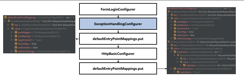 - LoginUrlAuthenticationEntryPoint 객체를 전달받아 defaultEntryPointMappings.put이라는 Map에 저장하게 된다.