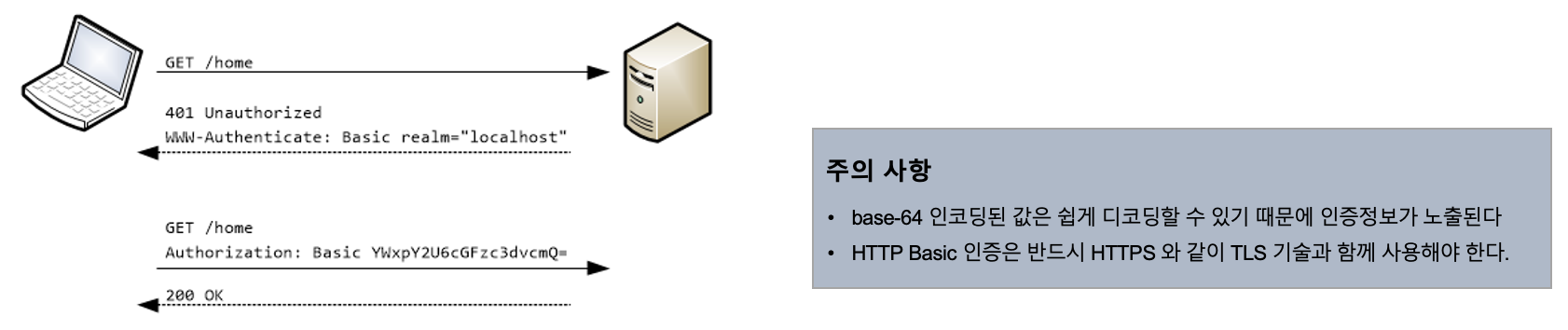 - 서버가 클라이언트에게 인증요구를 보낼 때 401 Unauthorized 응답과 함께 WWW-Authenticate 헤더를 기술해서 realm(보안영역) 과 Basic 인증방법을 보냄