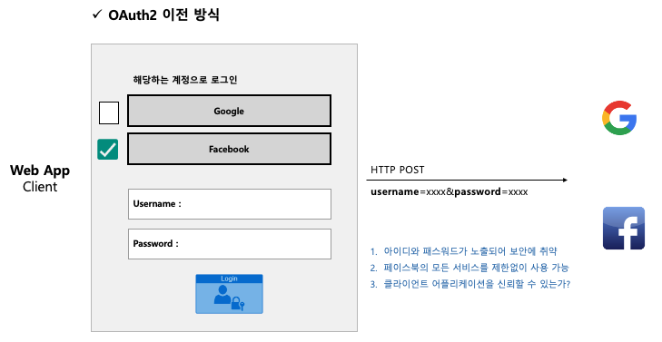 - web App에서는 사용자 정보를 알 수 없기에 위임 인가 서버(페이스 북)에 인증/인가 요청을 하여, 인증이 성공하면 성공적으로 사용자 정보를 가지고 와, 이를 활용하여, Web App의 기능을 작성할 수 있다.