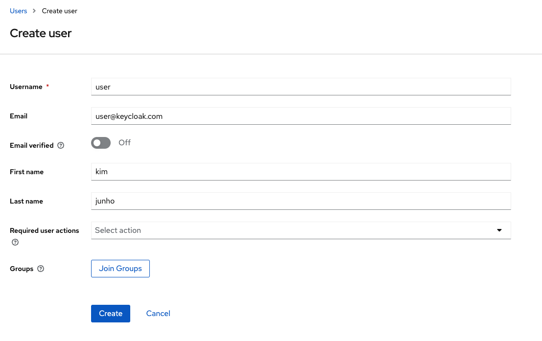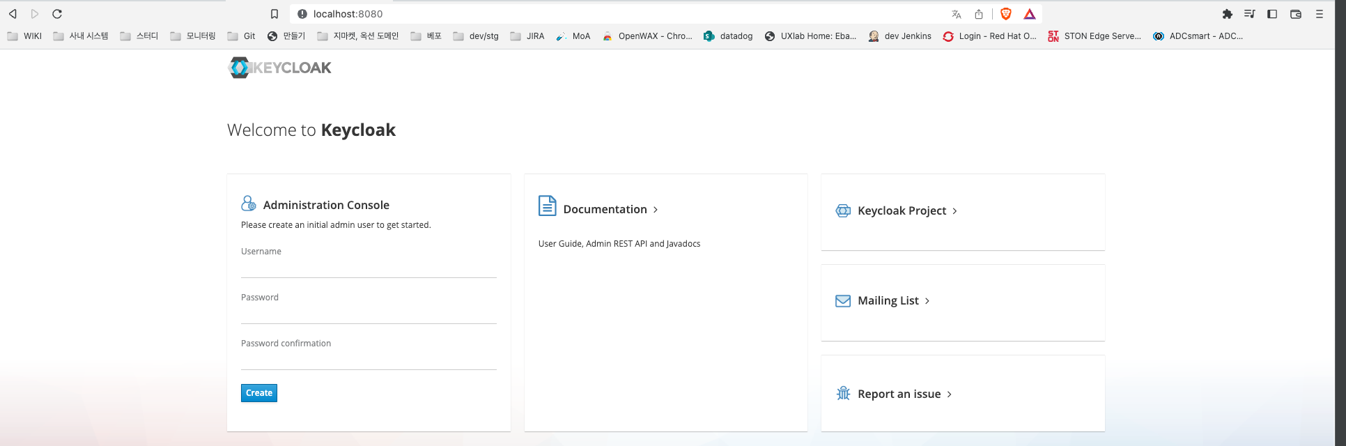 1) keycloak 실행 후, localhost:8080 접속하여, 어드민 계정 생성 후 어드민 화면 접속하기