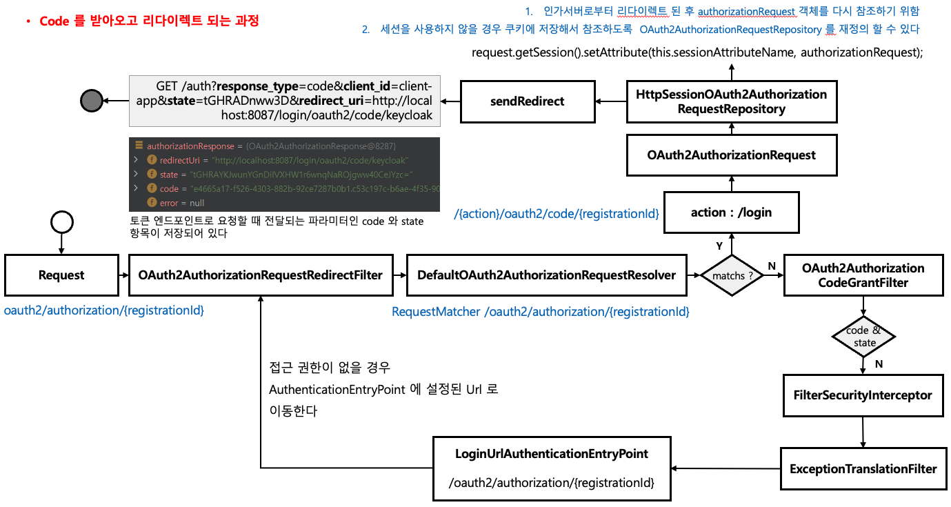 - 일치할 경우, /login/oauth2/code/{registrationId}를 통해 OAuth2AuthorizationRequest 객체를 만들고 이를HttpSessionOAuth2AuthorizationRequestRepository에 저장한다.