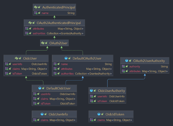 - 기본 구현체는 DefaultOidcUser 이며 DefaultOAuth2User 를 상속하고 있으며 인증 이후 Authentication 의 principal 속성에 저장된다