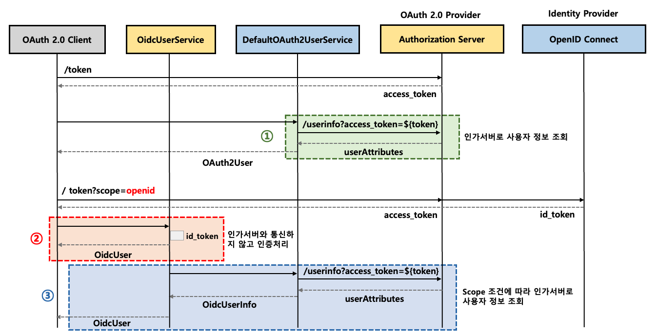 - OidcUserRequest 에 있는 ID Token(OicdUserService를 통해 인증 시에는 이미 scope에 openId를 추가한 경우이다)을 통해 인증 처리를 하며 필요시 DefaultOAuth2UserService 를 사용해서 UserInfo 엔드포인트의 사용자 속성을 요청한다