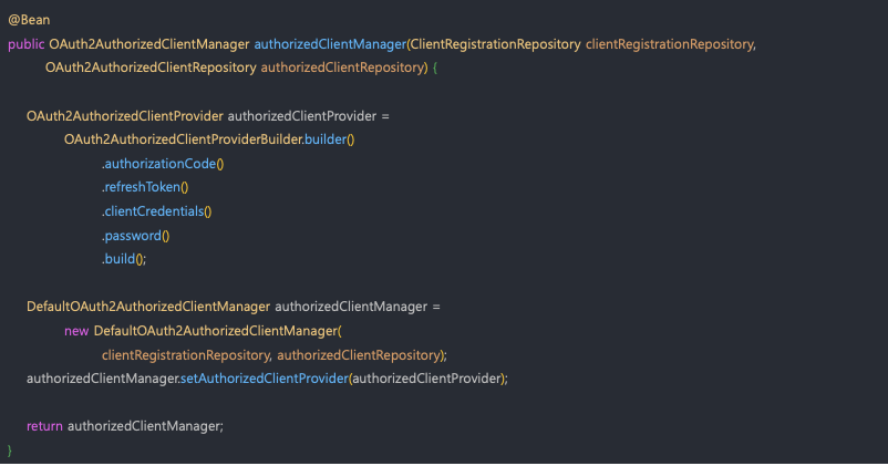 - OAuth2AuthorizedClientService 나 OAuth2AuthorizedClientRepository 에 OAuth2AuthorizedClient 저장을 위임한 후 OAuth2AuthorizedClient 최종 반환