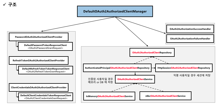 - OAuth2AuthorizedClientRepository, OAuth2AuthorizedClientService : OAuth2AuthorizedClient 객체를 관리