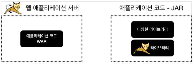최근에는 스프링 부트가 내장 톰캣을 포함하고 있다. 애플리케이션 코드 안에 톰캣 같은 WAS가 라이브러리로 내장되어 있다는 뜻이다. 개발자는 코드를 작성하고 JAR로 빌드한 다음에 해당 JAR를 원하는 위치에서 실행하기만 하면 WAS도 함께 실행된다.