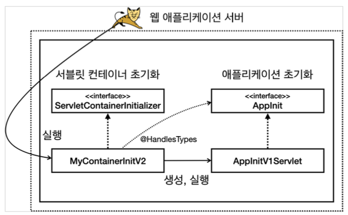 - @HandlesTypes 애노테이션에 애플리케이션 초기화 인터페이스를 지정한다.