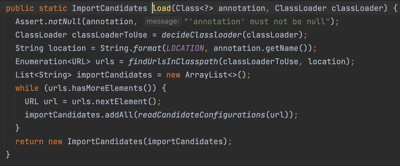 - getCandidateConfigurations를 살펴보면 ImportCadidates.load()를 통해 설정 정보를 읽어 온다.