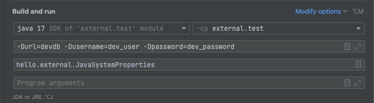 - -D VM 옵션을 통해서 key=value 형식을 주면 된다. 이 예제는 url=dev 속성이 추가된다.