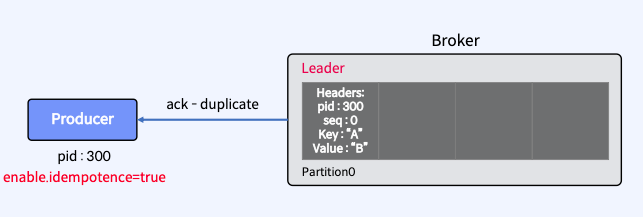 • 메시지를 저장하지 않고, Producer에게 DUP response를 리턴