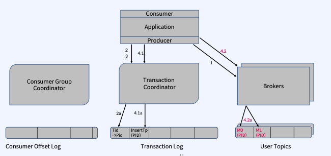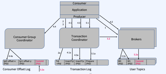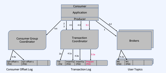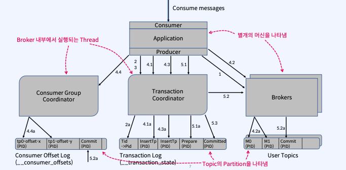 - Transaction Coordinator는 4.3a 단계에서 Transaction Log에 이 Topic Partition의 추가를 기록
