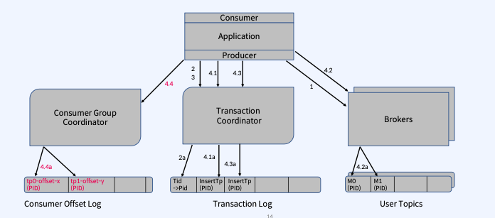 - TxnOffsetCommitRequest: Producer는 _ _consumer_offsets Topic에서 Offset을 유지하기 위해 TxnOffsetCommitRequest를 Consumer Coordinator에게 보냄 Consumer Coordinator는 전송되는 PID 및 Producer Epoch를 사용하여 Producer가 이 요청을 할 수 있는지(Zombie가 아님) 확인