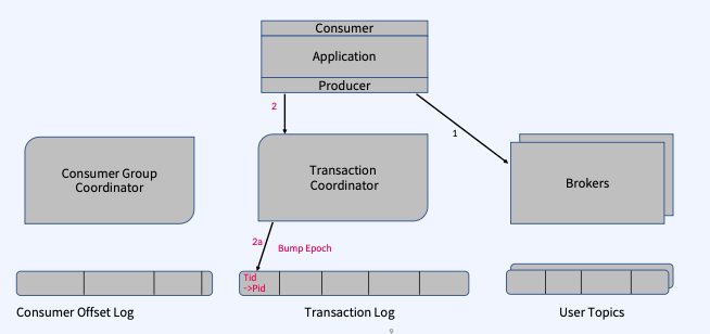 - Transaction Log : 새로운 Internal Kafka Topic으로써, Consumer Offset Topic과 유사하게, 모든 Transaction의 영구적이고 복제된 Record를 저장하는 Transaction Coordinator의 상태 저장소