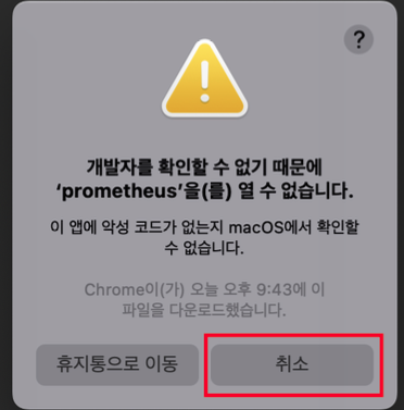 트러블 슈팅: MAC은 처음 실행하면 다음과 같은 메시지를 확인할 수 있다.