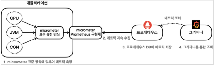 - 스프링 부트 액츄에이터와 마이크로미터를 사용하면 수 많은 메트릭을 자동으로 생성한다. 마이크로미터 프로메테우스 구현체는 프로메테우스가 읽을 수 있는 포멧으로 메트릭을 생성한다.