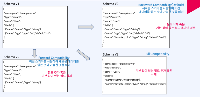 - 호환성 설정(Backward, Forward, Full)에 따라 스키마 진화(Schema Evolution) 가능