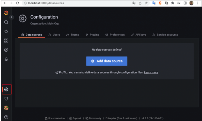 - 왼쪽 하단에 있는 설정(Configuration) 버튼에서 Data sources를 선택한다.
