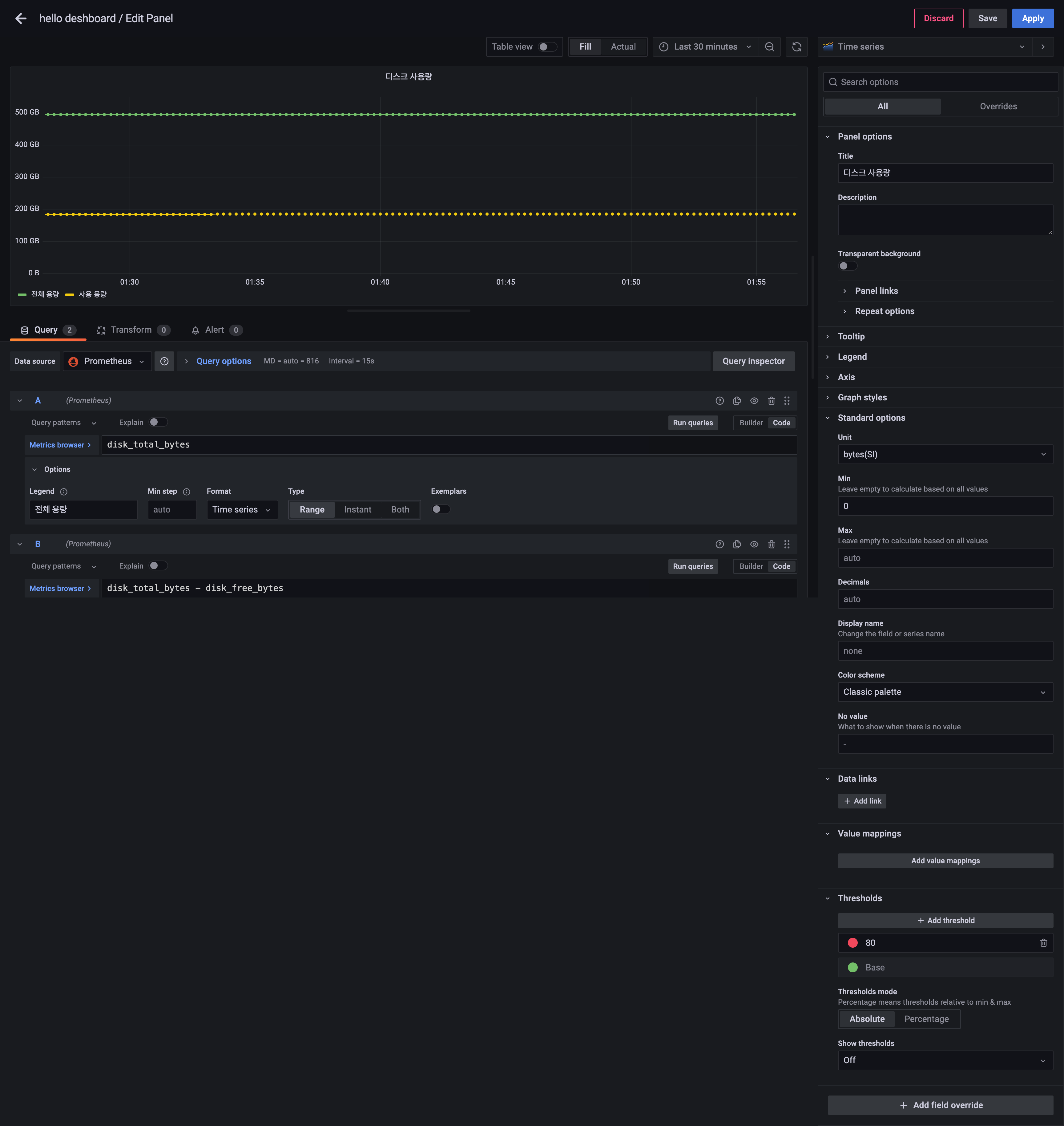 지금까지 CPU 사용량, 디스크 사용량 메트릭을 대시보드에 추가했다.