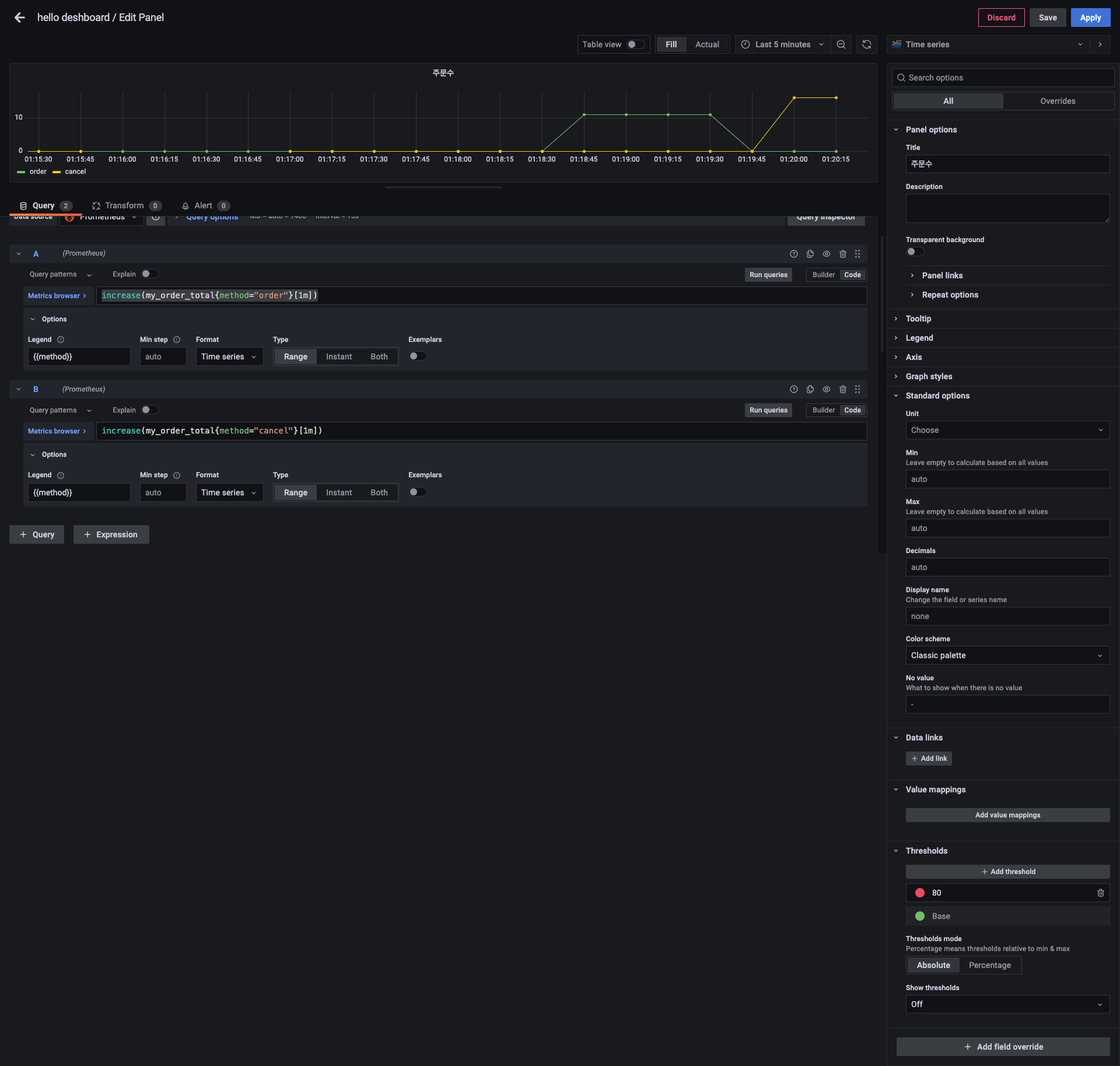 - increase(my_order_total{method="cancel"}[1m]) Legend : {{method}}