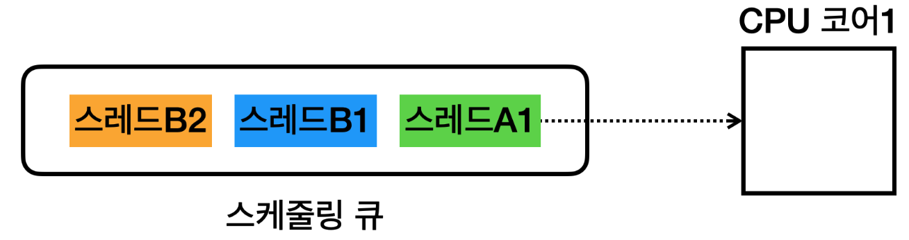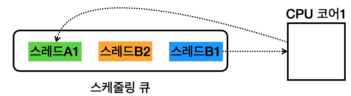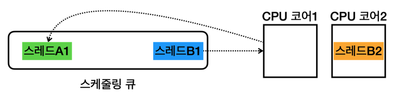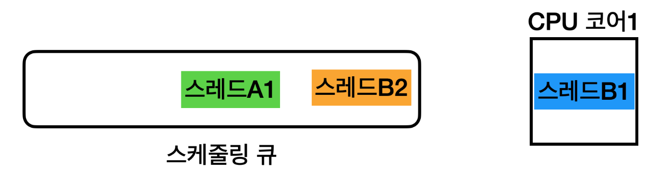 - 스레드A1, 스레드B1, 스레드B2가 스케줄링 큐에 대기한다.