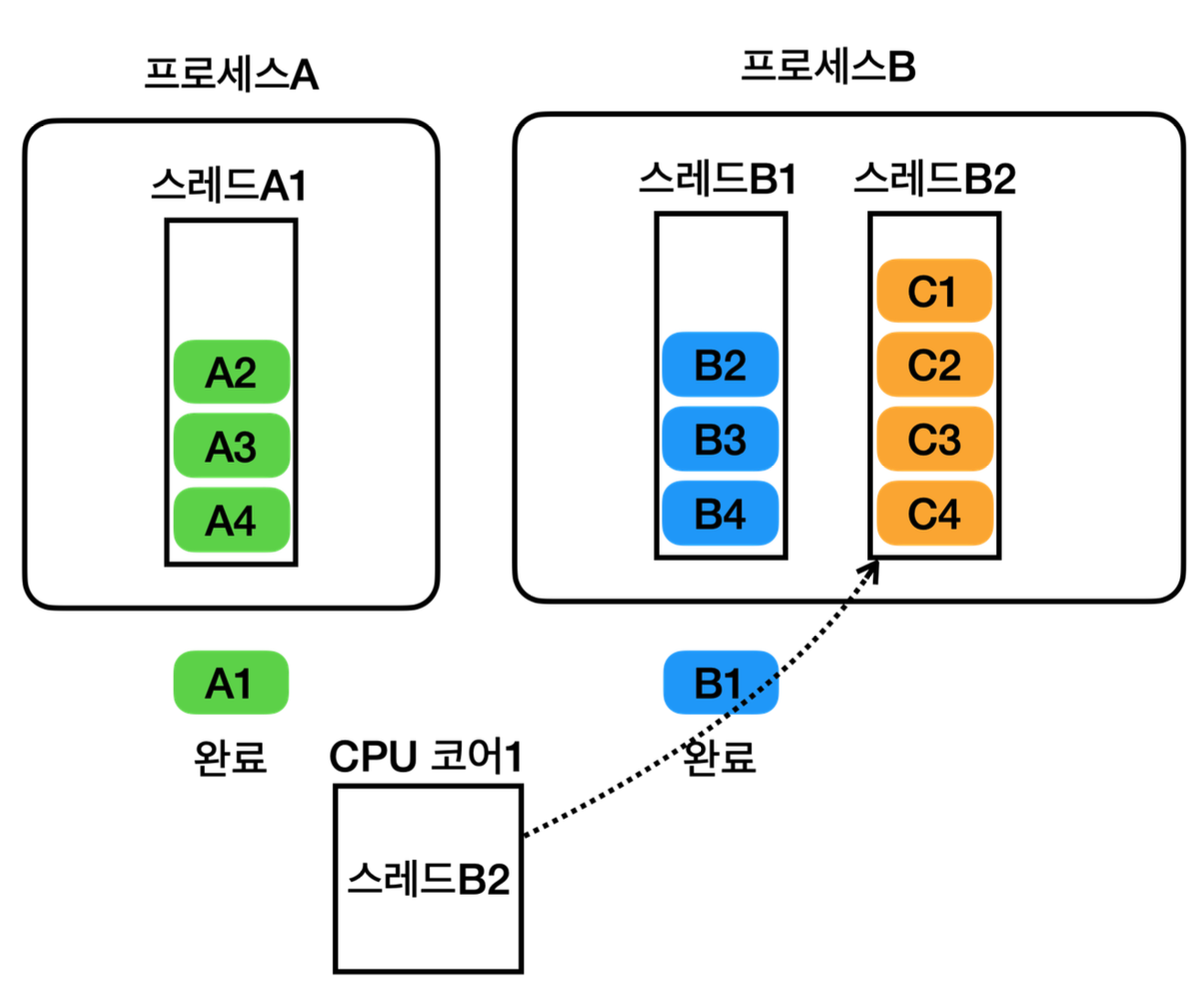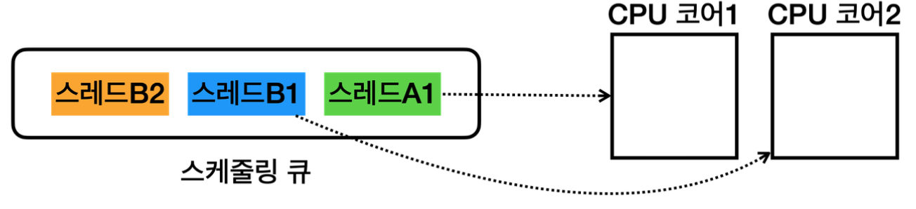 - 물론 조금 있다가 CPU 코어2에서 실행중인 스레드B2도 수행을 멈추고, 스레드 스케줄링 큐에 있는 다른 스레드 가 실행 될 것이다