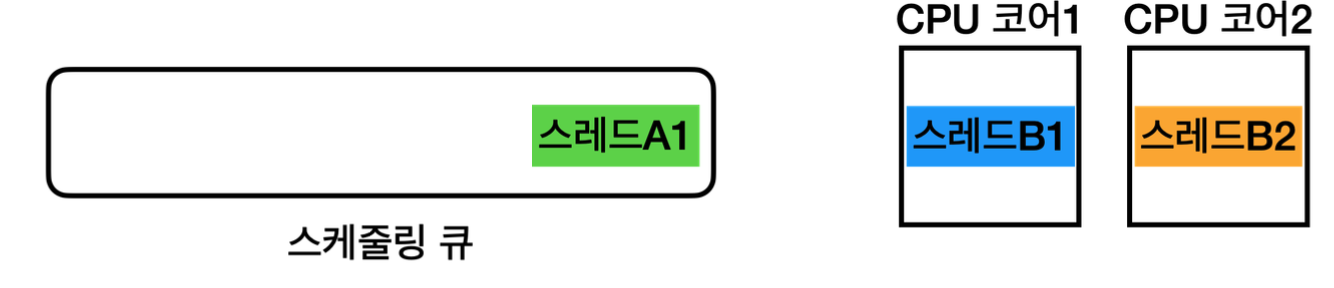- 스레드A1, 스레드B1을 병렬로 실행한다. 스레드B2는 스케줄링 큐에 대기한다.