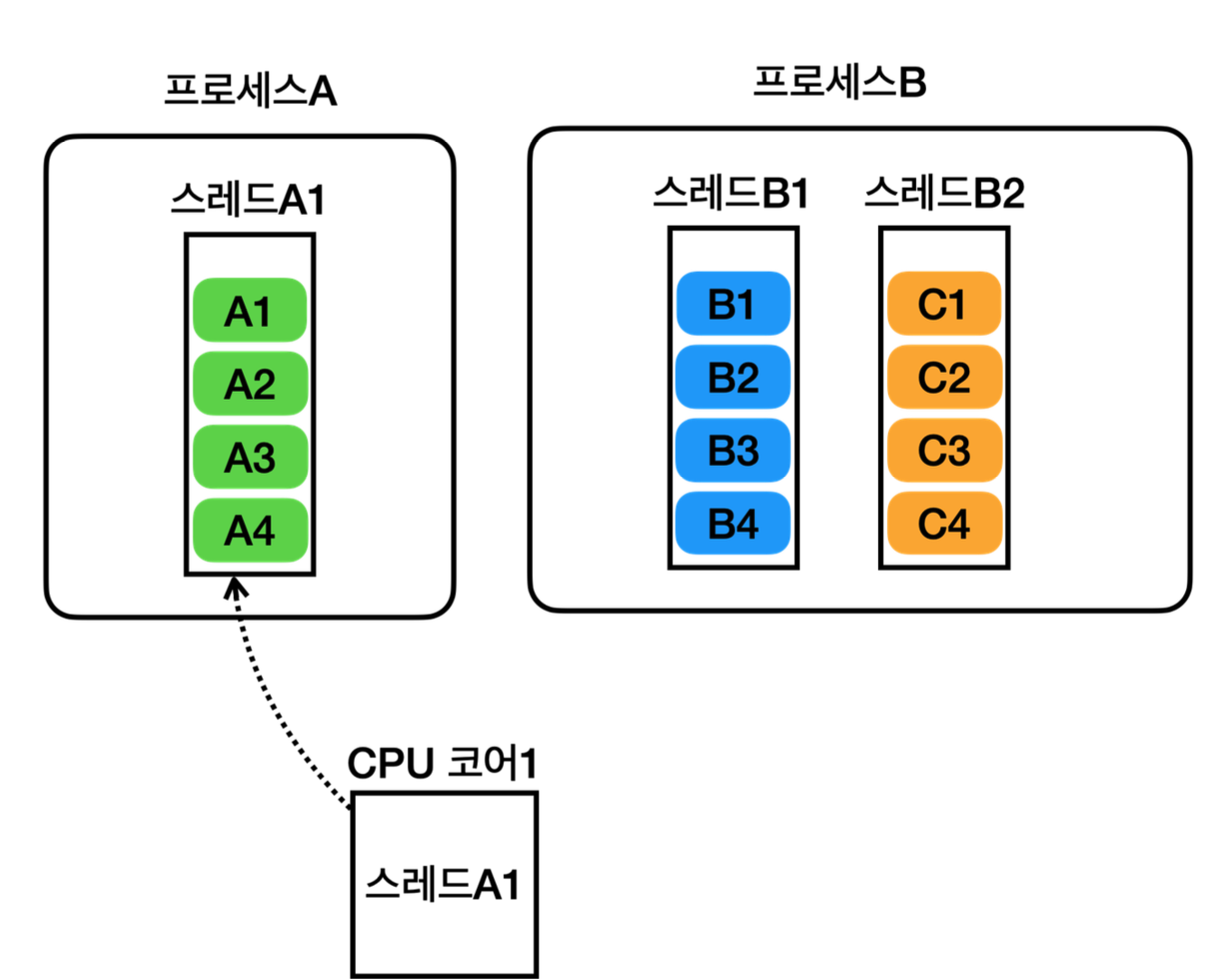- 이후에 프로세스A에 있는 스레드A1을 실행한다.