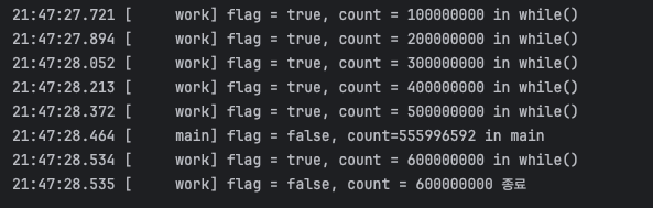 • 결과적으로 "main" 스레드가 flag 값을 false 로 변경하고 한참이 지나서야 "work" 스레드는 flag 값이 false 로 변경된 것을 확인한 것이다.