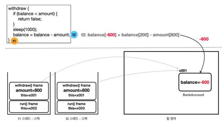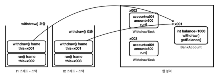 - 따라서 두 스레드는 같은 BankAccount(x001) 인스턴스에 접근하고 또 x001 인스턴스에 있는 잔액(balance) 필드도 함께 사용한다.