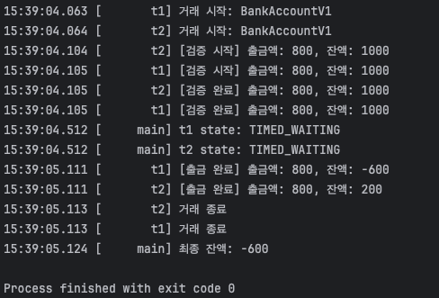 - 그렇다면 sleep(1000) 코드를 빼면 되지 않을까? 이렇게 하면 t1 이 검증 로직을 통과하고 바로 잔액을 줄일 수 있을 것 같다.