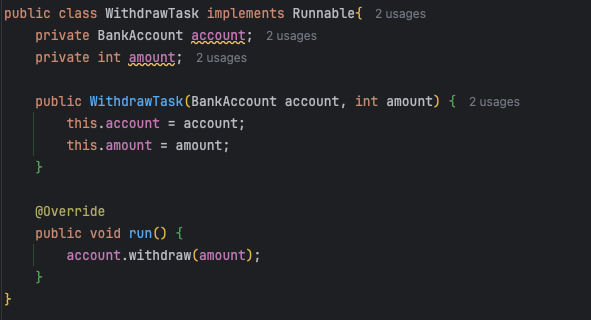 - 출금을 담당하는 Runnable 구현체이다. 생성 시 출금할 계좌( account )와 출금할 금액( amount )을 저장해 둔다.