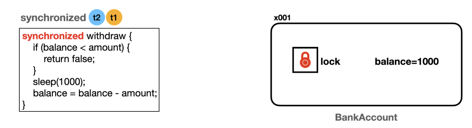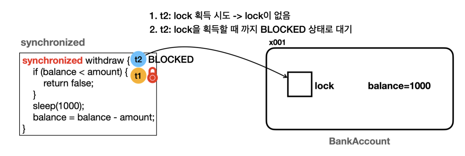 - 락이 있으므로 스레드 t1 은 BankAccount(x001) 인스턴스에 있는 락을 획득한다.