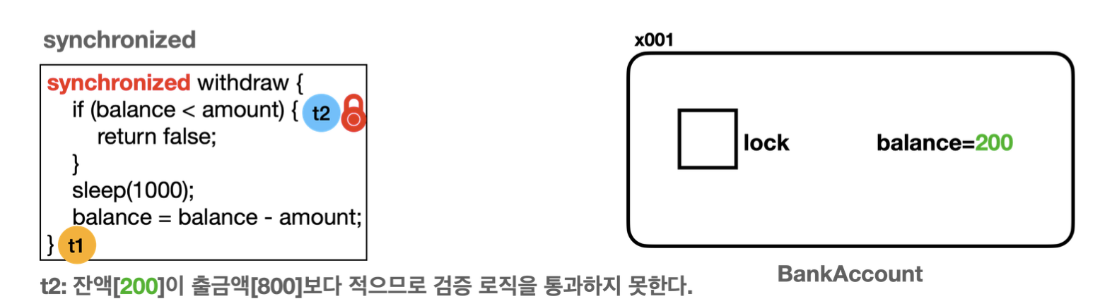 - 이제 withdraw() , getBalance() 메서드는 한 번에 하나의 스레드만 실행할 수 있다.