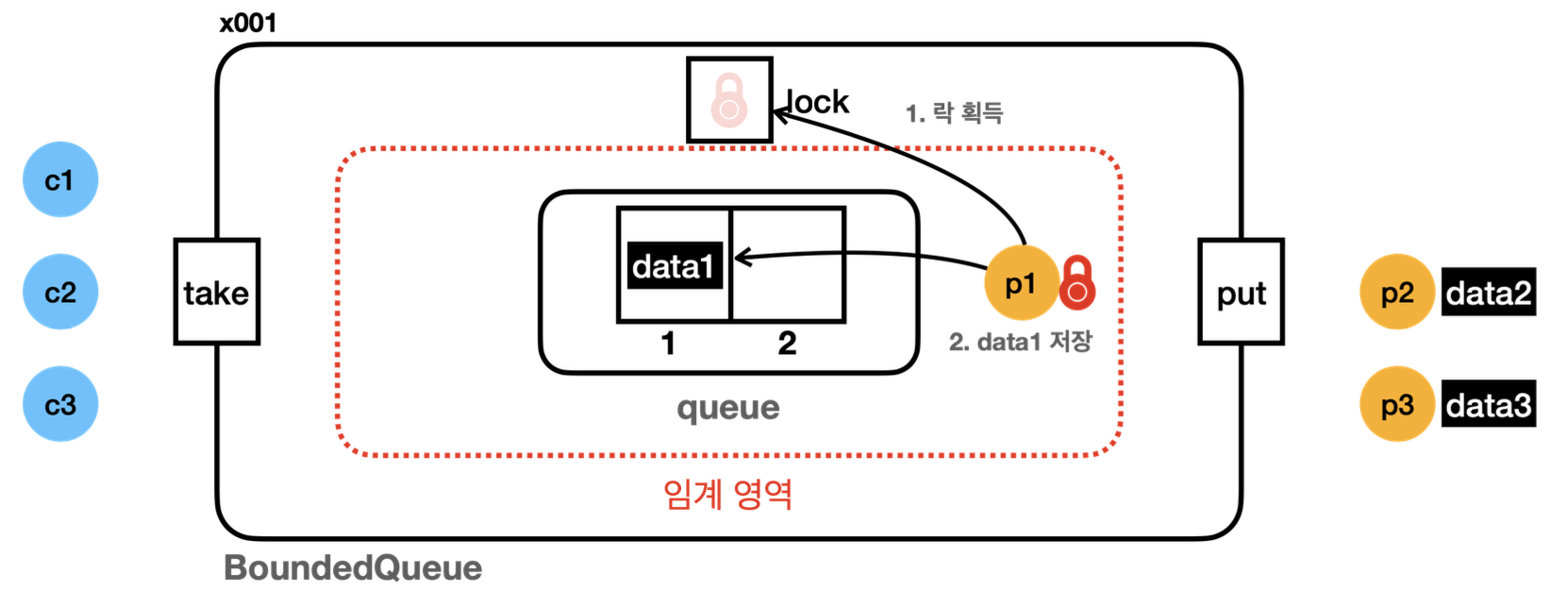 임계 영역: 여기서 핵심 공유 자원은 바로 queue(ArrayDeque)이다. 여러 스레드가 접근할 예정이므로 synchronized를 사용해서 한 번에 하나의 스레드만 put() 또는 take()를 실행할 수 있도록 안전한 임계 영역을 만든다. 예) put(data)을 호출할 때 queue.size()가 max 가 아니어서, queue.offer()를 호출하려고 한다. 그런데 호출하기 직전에 다른 스레드에서 queue에 데이터를 저장해서 queue.size()가 max로 변할 수 있다!